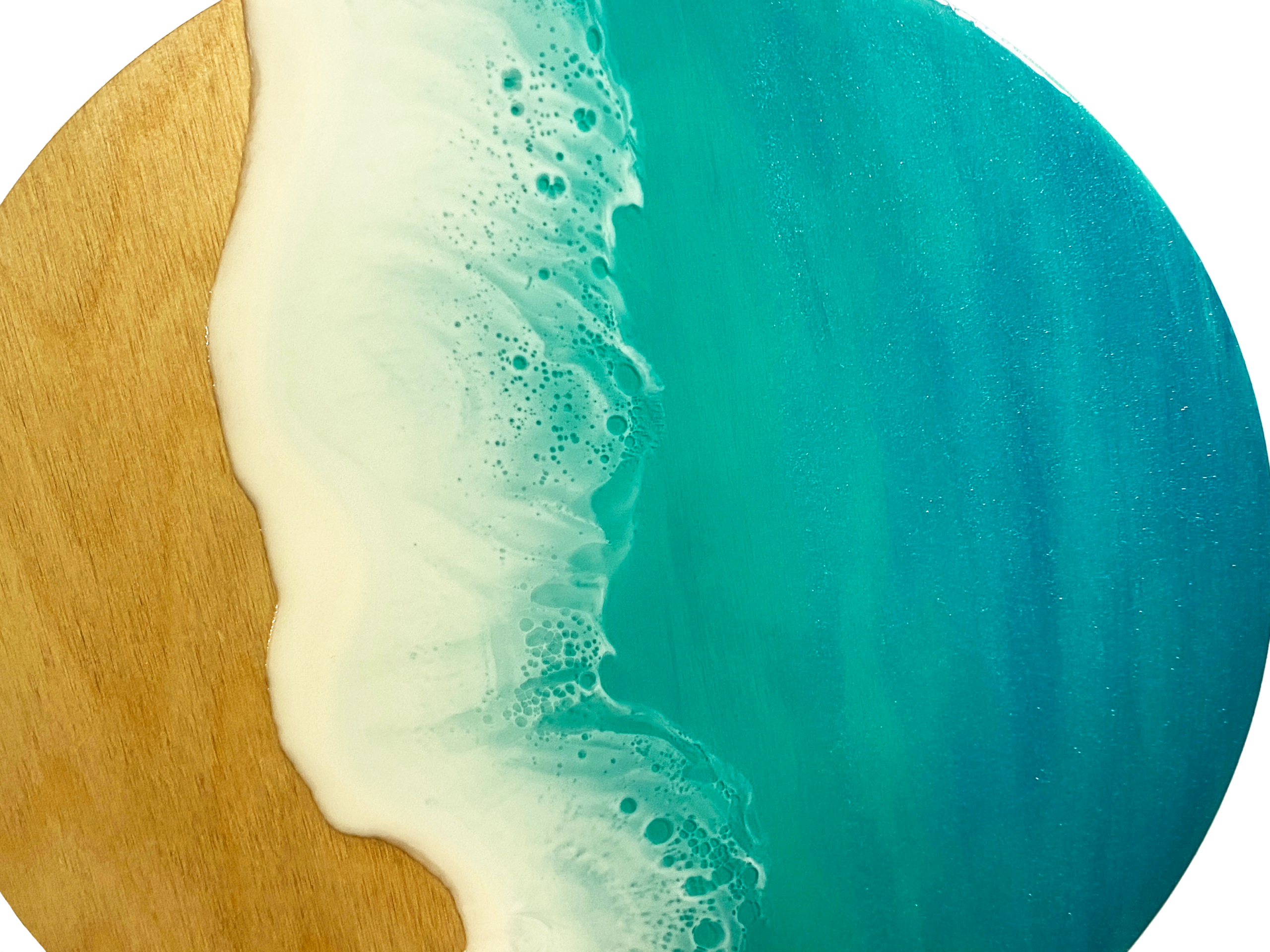 12″ round ocean painting on stained, floating wood panel